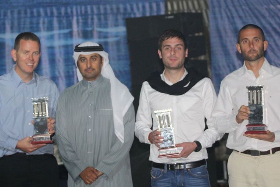 DOHA (QATAR): His Excellency Sheikh Hassan bin Jabor Al-Thani, President of the Qatar Marine Sports Federation (QMSF), made a special presentation to the Qatar Team's 2012 UIM F1H20 World Champion Alex Carella, chief mechanic and engine builder Brendan Power and the team's talented second driver Shaun Torrente at a gala dinner this weekend at the Doha Sheraton.